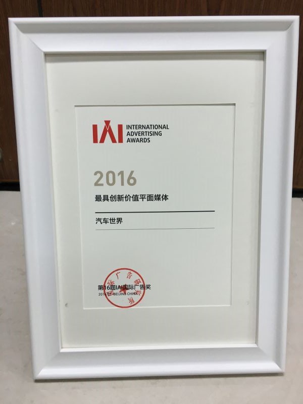 《汽车世界》杂志凭借设计创意方面的实力表现,成功斩获广告行业国际重量级奖项——IAI国际广告奖最具创新价值平面媒体奖,体现了IAI评委对《汽车世界》杂志“重装升级”的高度肯定。